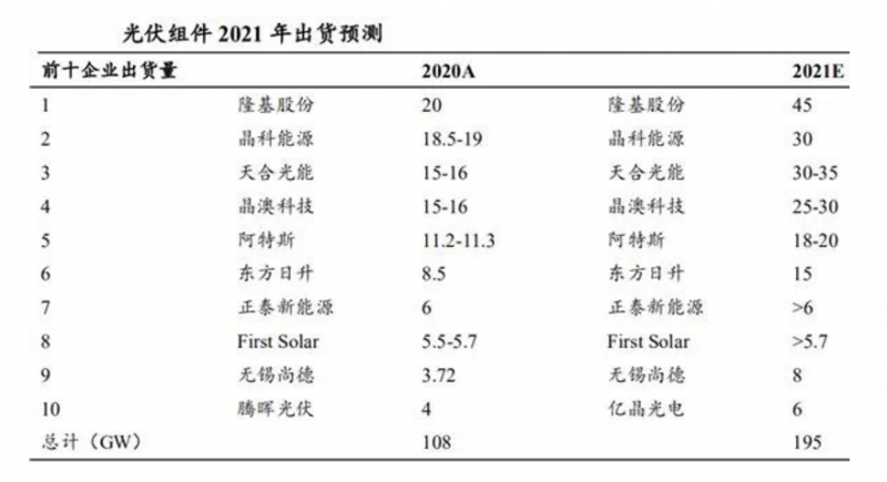 全球組件產(chǎn)能擴(kuò)張迅速。據(jù)預(yù)測(cè),2021 年全球光伏裝機(jī)量預(yù)計(jì)在 160~170GW 左右,以 1:1.2 容配比計(jì)算,對(duì)應(yīng)的組件總需求預(yù)計(jì)約為 192~204GW, 這意味著頭部企業(yè)的市占率目標(biāo)將超過(guò) 90%。根據(jù) BNEF 數(shù)據(jù),2020 年全球 Tier 1 組件產(chǎn)能約為 220GW,同比增長(zhǎng) 31.7%。根據(jù) PV Infolink 及公司公告數(shù)據(jù)統(tǒng)計(jì), 2021 年組件廠商產(chǎn)能預(yù)計(jì)約為 300GW,同比+33.76%,各家產(chǎn)能擴(kuò)張迅速。