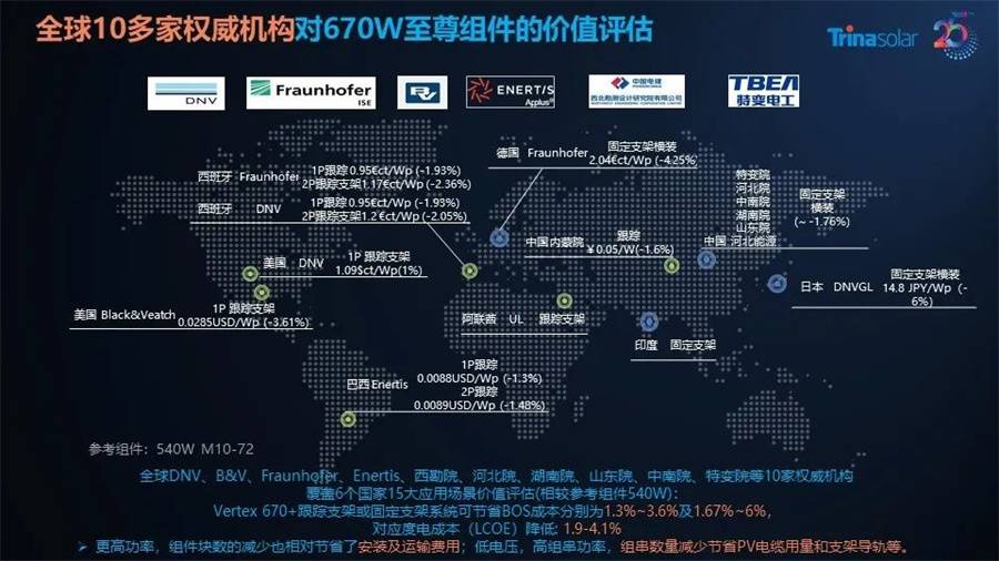 根據(jù)歐洲權(quán)威機(jī)構(gòu)Fraunhofer ISE研究分析,在德國(guó)地面電站場(chǎng)景中,至尊670W組件可節(jié)省系統(tǒng)BOS成本高達(dá)2.05歐分/瓦。