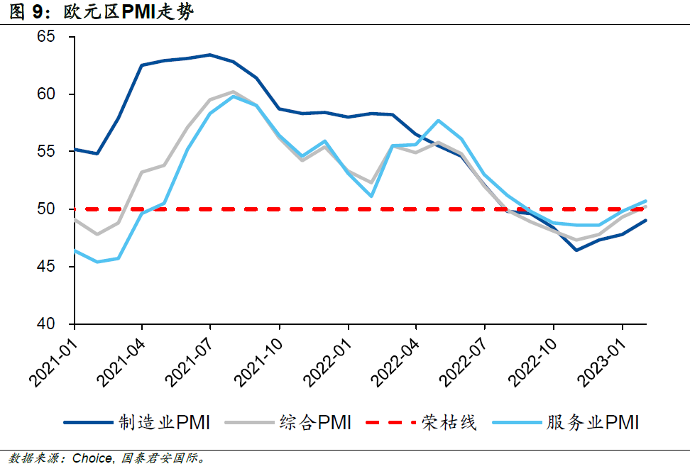 這一系列的政策效果在2022年末開始逐步顯露,歐洲的經(jīng)濟(jì)指標(biāo)開始出現(xiàn)回暖跡象。歐元區(qū)綜合PMI初值及服務(wù)業(yè)PMI初值在2023年1月扭轉(zhuǎn)了約半年的收縮趨勢(shì),回到了榮枯線上方;雖然制造業(yè)PMI仍處于收縮區(qū)間,但是收縮幅度也大幅改善。