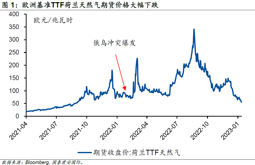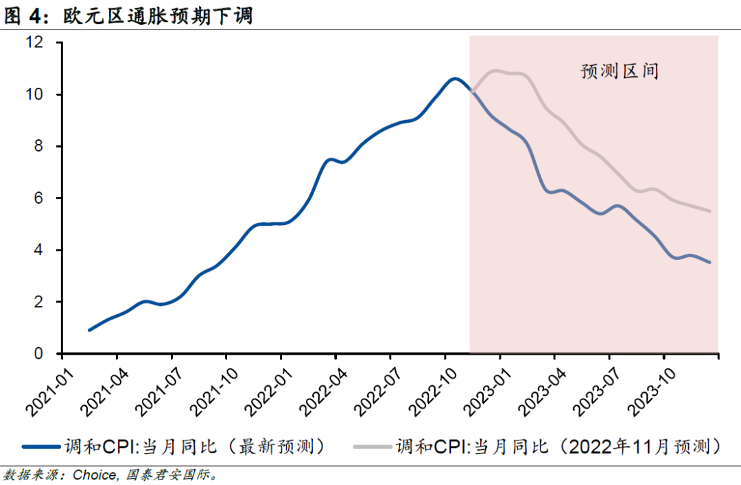 暖冬的到來(lái)極大程度上縮減了供熱對(duì)天然氣的需求,歐洲基準(zhǔn)TTF荷蘭天然氣期貨價(jià)格延續(xù)了之前的大幅回落趨勢(shì)。截至2023年1月中旬,期貨價(jià)格已經(jīng)低于俄烏沖突爆發(fā)前的水平。在天然氣價(jià)格走低的情況下,能源價(jià)格不應(yīng)該繼續(xù)推動(dòng)通脹高企;另一方面,隨著中國(guó)2023年經(jīng)濟(jì)預(yù)期的大幅上修,歐元區(qū)出口有望迎來(lái)顯著改善。歐洲2023年的衰退預(yù)期似乎也應(yīng)該畫上一個(gè)問(wèn)號(hào)?