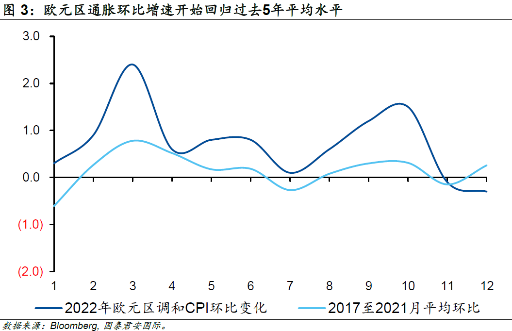 另一方面,歐元區(qū)通脹環(huán)比增速顯著高于季節(jié)性的趨勢(shì)已經(jīng)開始扭轉(zhuǎn),這意味著通脹的增長(zhǎng)動(dòng)能開始減弱,2022年11月及12月已經(jīng)連續(xù)兩個(gè)月低于歷史平均水平。