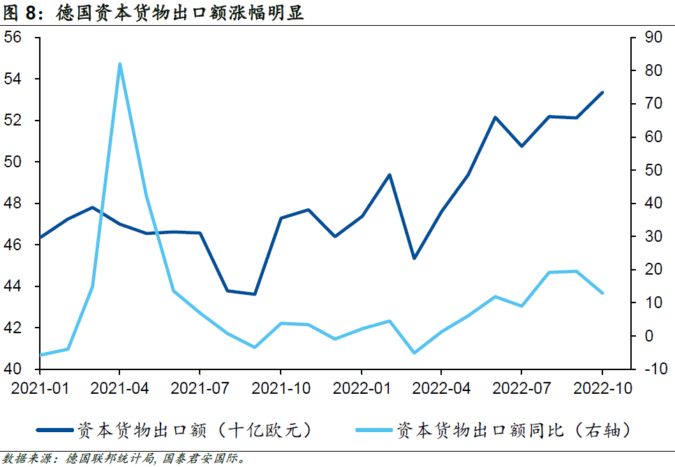更加重要的是,為了應(yīng)對(duì)中長(zhǎng)期能源危機(jī),歐盟各國(guó)也開始加大對(duì)制造業(yè)的支持力度,制定了“能源系統(tǒng)數(shù)字化”計(jì)劃,該計(jì)劃預(yù)期在2030年前在基礎(chǔ)設(shè)施方面投資5,650億歐元,以大力發(fā)展光伏和新能源汽車產(chǎn)業(yè);除此以外,歐盟還加大了對(duì)液化天然氣產(chǎn)業(yè)的投資力度。德國(guó)作為歐洲經(jīng)濟(jì)的最重要組成部門,受益于政策支持,其工業(yè)生產(chǎn)并沒有受到太多能源問(wèn)題的干擾,尤其是核心的資本貨物出口額在衰退預(yù)期的背景下持續(xù)增長(zhǎng)。
