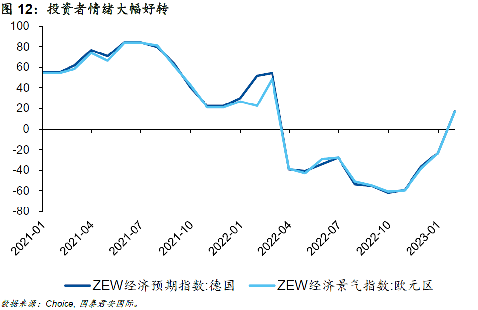 往前看,反映歐元區(qū)及德國(guó)投資者情緒的指標(biāo)“ZEW經(jīng)濟(jì)景氣指數(shù)”大幅好轉(zhuǎn)。在能源問(wèn)題好轉(zhuǎn)、中國(guó)經(jīng)濟(jì)向好的背景下,能源密集型企業(yè)及出口型企業(yè)的盈利預(yù)期也開始上修,2023年1月德國(guó)ZEW經(jīng)濟(jì)景氣指數(shù)錄得16.9,遠(yuǎn)超預(yù)期值-15及前值-23.3。