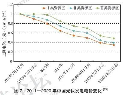 近年來,在全球可再生能源成本迅速下降的過程中,除了政策支持和技術(shù)進步以外,產(chǎn)業(yè)規(guī)模經(jīng)濟和規(guī)模效益是不容忽視的重要推力。中國得益于較為完備的基礎(chǔ)工業(yè)體系和龐大的市場,在推動風(fēng)電、光伏發(fā)電、生物質(zhì)發(fā)電、動力電池、氫能利用等產(chǎn)業(yè)發(fā)展過程中,發(fā)揮了巨大的規(guī)模經(jīng)濟優(yōu)勢。2013年以來,在國家政策的大力支持下,中國光伏發(fā)電產(chǎn)業(yè)不斷擴大規(guī)模,迅速發(fā)展為全球最大的市場,同時也擺脫了困擾光伏產(chǎn)業(yè)多年的“兩頭在外”的尷尬局面。2013—2018年,中國光伏裝機容量達到1.74×108kW,年復(fù)合增長率超過73%,較2012年的0.065×108kW增長26 倍。光伏發(fā)電上網(wǎng)電價從2011年的1元/(kW·h),下降到2020年的0.35~0.49 元/(kW·h)(2020年6月1日開始實施)(圖7)。在這一過程中,國內(nèi)涌現(xiàn)出一批優(yōu)秀的光伏企業(yè),在2019全球光伏企業(yè)20強排行榜上有16家中國公司,前10名中有7家中國公司。