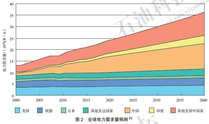 第二,現(xiàn)有能源利用系統(tǒng)變革,電力、氫能等二次能源消費規(guī)模不斷擴大。電力在終端能源消耗中所占的比例已從2000年的16%,增長到2018年的20%。國際可再生能源署(IRENA)認(rèn)為,全球電力需求量將持續(xù)高速增長,2050年,電力在終端能源消費中所占比例將提高到49%左右。國際能源署認(rèn)為,全球電力需求的增長在發(fā)達國家和發(fā)展中國家將表現(xiàn)出兩條截然不同的路徑:在發(fā)達國家,電力需求增長將被數(shù)字化和電氣化技術(shù)進步帶來的能效全面提升所抵消;在發(fā)展中國家,家庭收入的增長、工業(yè)規(guī)模的擴大和服務(wù)業(yè)的發(fā)展正在有力地推動電力需求增長,按照既定政策,預(yù)計2019—2040年,發(fā)展中國家對全球電力需求增長的貢獻接近90%(圖2)。
