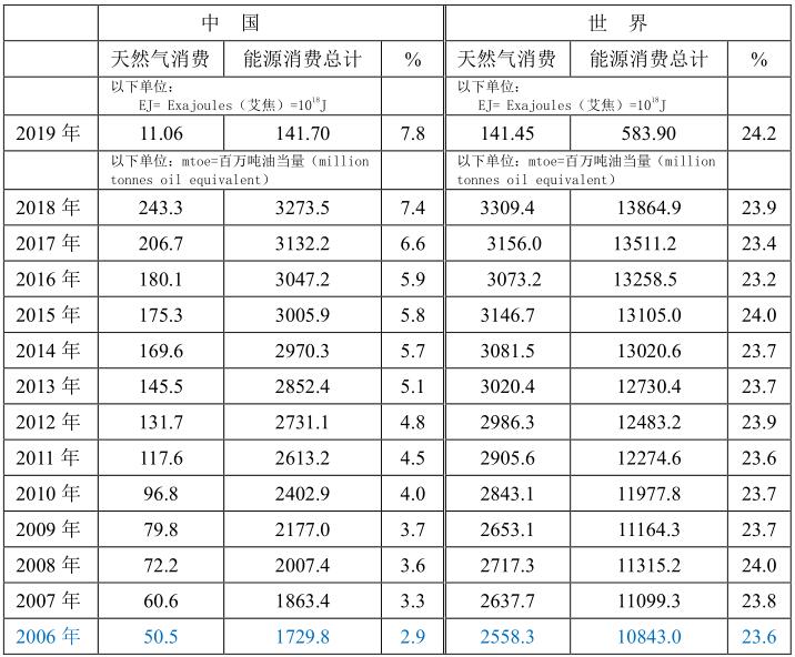 天然氣消費(fèi)量是指本國(guó)天然氣產(chǎn)量和進(jìn)口量之和。中國(guó)于2006年開始LNG國(guó)際貿(mào)易,2010年管輸國(guó)際貿(mào)易開始,因此從下表可以看出,2006年中國(guó)天然氣剛開始進(jìn)口,消費(fèi)量?jī)H占世界天然氣消費(fèi)總量的2.1%,但隨著LNG和管輸國(guó)際貿(mào)易以來,中國(guó)天然氣消費(fèi)量?jī)H占世界天然氣消費(fèi)總量的比例(%)逐年增加,到2019年中國(guó)天然氣消費(fèi)占世界消費(fèi)總量的比例已經(jīng)達(dá)到7.8%。