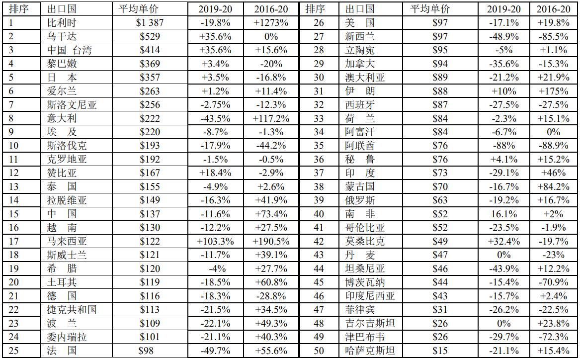 2019年至2020年,平均單價(jià)增長(zhǎng)最快的國(guó)家是馬來(lái)西亞(增長(zhǎng)103.3%)、烏干達(dá)(增長(zhǎng)35.6%)、莫桑比克(增長(zhǎng)32.4%)、贊比亞(增長(zhǎng)18.4%)和伊朗(增長(zhǎng)10%)。