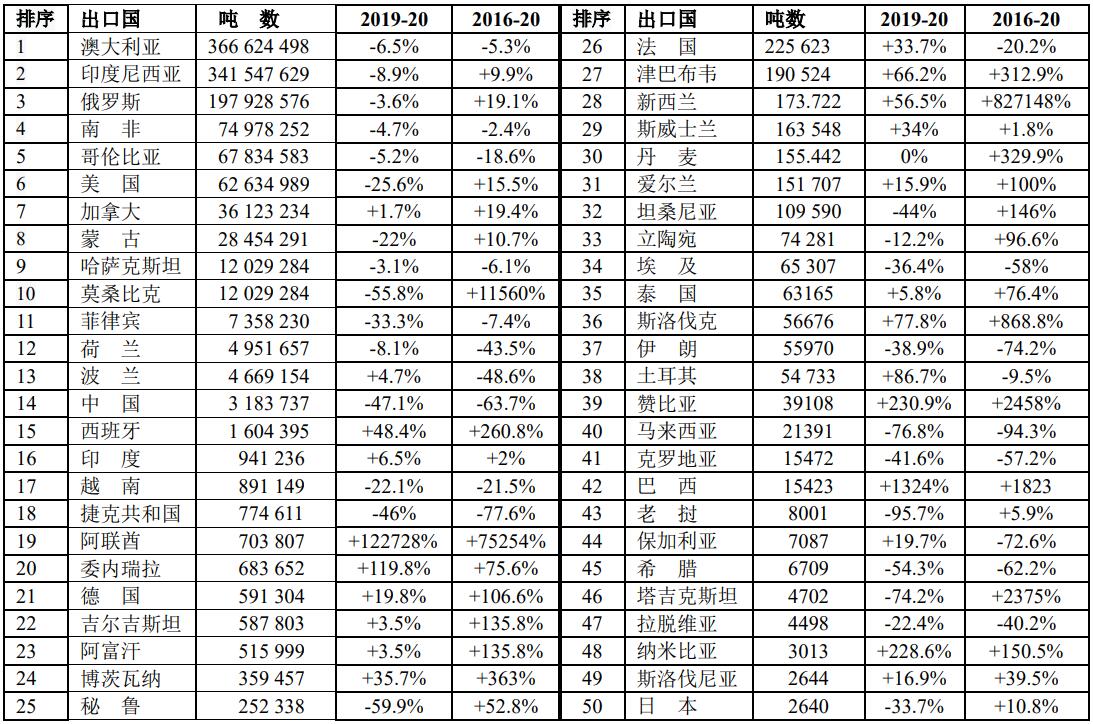 2020年煤出口國(guó)有50位,占全球出口煤量的99.6%。