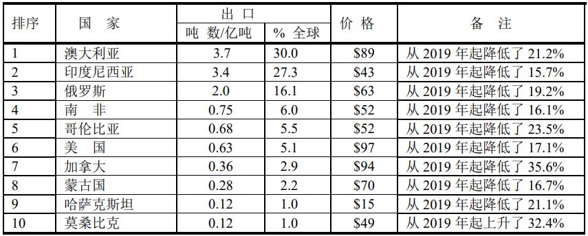 2020年全球煤出口量為12.46億噸,煤出口前10位國(guó)家占全球總量的97.1%。其中最大的出口國(guó)是澳大利亞,占全球總量的30%。