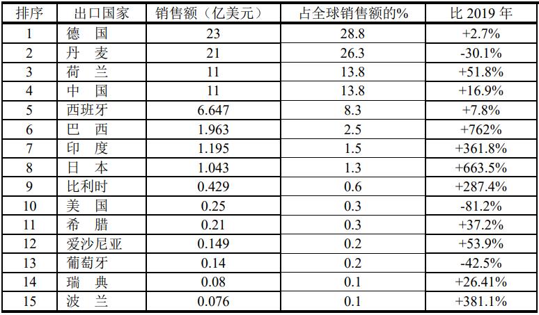 在上述15家全球供應(yīng)商中,有12個國家從2019年至2020年的風(fēng)力發(fā)電出口中獲得了更大的收入。從2019年到2020年,瑞典(增長26.41%)、巴西(增長762%)、日本(增長663.5%)、波蘭(增長381.1%)、印度(增長361.8%)和比利時(增長287.4%)的增長最為強勁。
