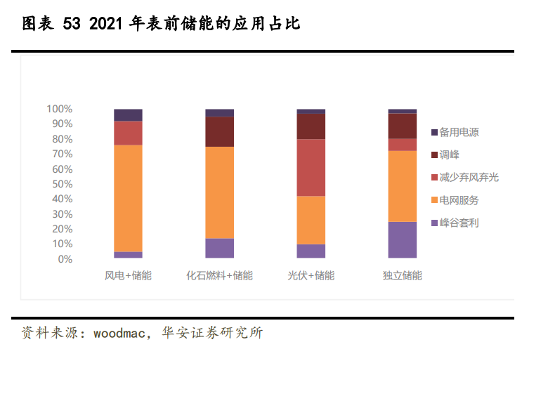 按照是否與新能源電站共址,可將儲(chǔ)能分為獨(dú)立儲(chǔ)能和新能源配儲(chǔ),2020 年之前美 國(guó)表前儲(chǔ)能裝機(jī)以獨(dú)立儲(chǔ)能為主,且主要滿足功率型需求,配儲(chǔ)時(shí)長(zhǎng)普遍較短,2021 年 起美國(guó)表前儲(chǔ)能中新能源配儲(chǔ)的裝機(jī)規(guī)模大幅領(lǐng)先獨(dú)立儲(chǔ)能。隨著越來越多光伏系統(tǒng)接 入電網(wǎng),預(yù)計(jì)能量型需求占比將提升,有望驅(qū)動(dòng)表前儲(chǔ)能平均配儲(chǔ)時(shí)長(zhǎng)提高至 4 小時(shí)。 表前儲(chǔ)能的主要作用為電網(wǎng)服務(wù)、峰谷套利、調(diào)峰、減少棄風(fēng)/棄光及備用電源,其 中獨(dú)立儲(chǔ)能主要側(cè)重于電網(wǎng)服務(wù)(50%),光伏配儲(chǔ)更側(cè)重于減少棄光(40%)。
