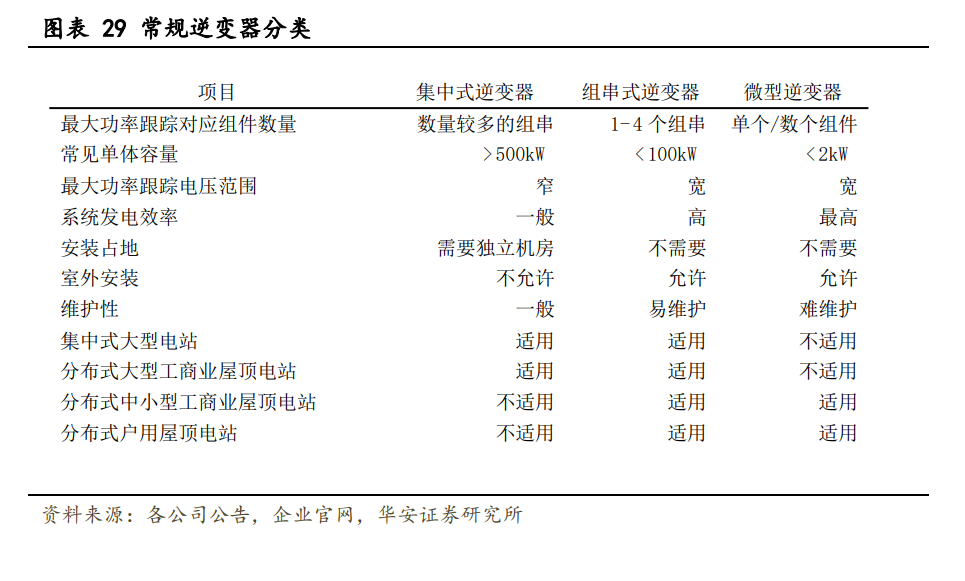 組串 PCS 彌補集中式不足,開啟規(guī)?;瘧?yīng)用。業(yè)內(nèi)目前電池儲能系統(tǒng)主要采取集中 式 PCS,多組電池并聯(lián)將引起電池簇之間的不均衡,久之并聯(lián)電池簇中會出現(xiàn)一部分電 池實際出力不足,而另一部分超出倍率使用的現(xiàn)象,造成“木桶”效應(yīng);而組串式 PCS 可 以實現(xiàn)簇級管理,提升系統(tǒng)壽命,提高全壽命周期放電容量,規(guī)模化應(yīng)用趨勢已見雛形。 當(dāng)前市場以組串式逆變器為主,微型逆變器尚處于發(fā)展階段。綜合考慮逆變器的不同技 術(shù)并結(jié)合其市場策略做出選擇的背景下,當(dāng)前組串式逆變器仍是市場較為主流選擇。目 前,華為、陽光電源、固德威、錦浪科技等光伏逆變器的核心供應(yīng)商均在組串式逆變器 有布局。而微型逆變器作為一種新的技術(shù)路線尚處于發(fā)展期,技術(shù)門檻較高,供應(yīng)商較 少。國外的微型逆變器市場發(fā)展較早,但出貨仍集中于海外龍頭 Enphase。我國微型逆變 器供應(yīng)商較少,一方面是因為國內(nèi)相關(guān)技術(shù)研發(fā)較晚,另一方面是因為國內(nèi)市場對于微 型逆變器的需求處于導(dǎo)入階段,尚未進入放量階段。