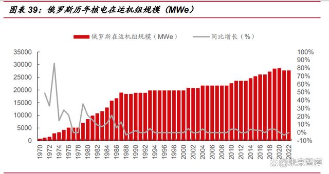 俄羅斯正處于核電的穩(wěn)步發(fā)展期,包括新技術(shù)研發(fā)以及產(chǎn)品出口。2022 年底俄 羅斯核電在運(yùn)機(jī)組 27.7GW,同比持平,在建 2.7GW。2020 年俄羅斯核電發(fā)電量 2157 億 kWh,占總發(fā)電量比例 20%。除本土建設(shè)外,核電產(chǎn)品以及服務(wù)的出口是俄羅斯的重要政策和經(jīng)濟(jì)目標(biāo),20 多座核電反應(yīng)堆已確認(rèn)或計(jì)劃出口建設(shè)。
