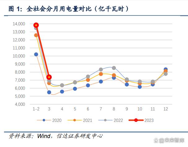 結構方面,2023Q1 第一產(chǎn)業(yè)用電量同比增長 9.7%,第二產(chǎn)業(yè)用電量同比增長 4.2%,第三產(chǎn)業(yè)用電量同比增長 4.1%,而城鄉(xiāng)居民生活用電量同比增長僅 0.2%(一二三產(chǎn)及居民 生活用電占全社會用電量的比重分別為 1.25%、65.17%、17.43%、16.15%),居民生活 用電的低增長拖累一季度整體用電量的增速。從電力消費彈性系數(shù)來看,2022 年度全社會 用電量增速為 3.6%,GDP 增速為 3%,電力消費彈性系數(shù)達到 1.2;然而受居民生活用電 2023Q1 增速大幅放緩的影響,2023Q1 我國在實現(xiàn) 4.5%的 GDP 增速同時,用電量增速僅 3.6%,電力消費彈性系數(shù)下降至 0.8。 其中,1-2月一、二、三產(chǎn)業(yè)和城鄉(xiāng)居民生活用電量分別同比變化6.64%、3.48%、-0.11%、 2.75%,而 3 月單月的一、二、三產(chǎn)業(yè)和城鄉(xiāng)居民生活用電量分別同比變化 18.65%、 6.67%、14.04%、-5.76%。3 月以來開工復蘇潮表現(xiàn)明顯,二產(chǎn)用電增速穩(wěn)中向好,三產(chǎn) 用電增速大幅反彈,但 3 月份居民生活用電同比下降 5.76%,相較于去年同期(2022 年 3 月)高達 8.92%的居民生活用電增速,降幅高達 14.68pct。暖冬對于居民生活用電影響較 大,2 月下旬至 3 月上旬,我國中東部地區(qū)氣溫明顯升高,相比常年同期偏暖。