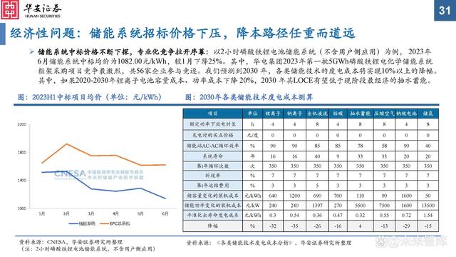 經(jīng)濟(jì)性問題:儲(chǔ)能系統(tǒng)招標(biāo)價(jià)格下壓,降本路徑任重而道遠(yuǎn)。儲(chǔ)能系統(tǒng)中標(biāo)價(jià)格不斷下探,專業(yè)化競(jìng)爭(zhēng)拉開序幕:以2小時(shí)磷酸鐵鋰電池儲(chǔ)能系統(tǒng)(不含用戶側(cè)應(yīng)用)為例,2023年6月儲(chǔ)能系統(tǒng)中標(biāo)均價(jià)為1082.00元/kWh,較1月下降25%。其中,華電集團(tuán)2023年第一批5GWh磷酸鐵鋰電化學(xué)儲(chǔ)能系統(tǒng)框架采購項(xiàng)目競(jìng)爭(zhēng)最激烈,共56家企業(yè)參與競(jìng)逐。我們預(yù)測(cè)到2030 年,各類儲(chǔ)能技術(shù)的度電成本將實(shí)現(xiàn)10%以上的降幅。其中,如果2020-2030年鋰離子電池容量成本、功率成本下降 20%,2030 年其LOCE有望低于現(xiàn)階段最經(jīng)濟(jì)的抽水蓄能。