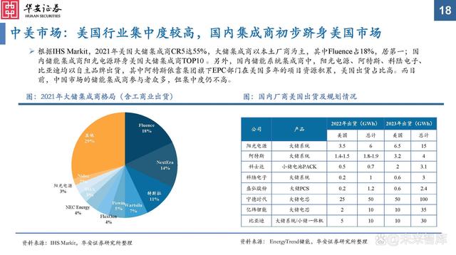 根據(jù)IHS Markit,2021年美國(guó)大儲(chǔ)集成商CR5達(dá)55%,大儲(chǔ)集成商以本土廠商為主,其中Fluence占18%,居第一;國(guó)內(nèi)儲(chǔ)能集成商陽光電源躋身美國(guó)大儲(chǔ)集成商TOP10 。另外,國(guó)內(nèi)儲(chǔ)能系統(tǒng)集成商中,陽光電源、阿特斯、科陸電子、比亞迪均以自主品牌出貨,其中阿特斯依靠集團(tuán)旗下EPC部門在美國(guó)多年的項(xiàng)目資源積累,美國(guó)出貨占比高。而目前,中國(guó)市場(chǎng)的儲(chǔ)能集成商參與者眾多,但集中度仍不高。