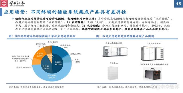 儲(chǔ)能行業(yè)應(yīng)用場(chǎng)景主要可分為電源側(cè)、電網(wǎng)側(cè)和用戶側(cè)三類:其中安裝在電源側(cè)與電網(wǎng)側(cè)的儲(chǔ)能稱之為“表前儲(chǔ)能”,而用戶側(cè)的儲(chǔ)能則稱為“表后儲(chǔ)能”。1)表前儲(chǔ)能:又稱“大儲(chǔ)”,主要應(yīng)用在新能源電站、電網(wǎng)等場(chǎng)景,儲(chǔ)能功率大,屬于電力工程投資,應(yīng)用端強(qiáng)調(diào)安全穩(wěn)定;2)表后儲(chǔ)能:分為工商業(yè)和戶用,儲(chǔ)能功率較小。2022年,大儲(chǔ)在電化學(xué)儲(chǔ)能裝機(jī)中占比達(dá)92%,處于主導(dǎo)地位。根據(jù)下游儲(chǔ)能應(yīng)用場(chǎng)景差異化,儲(chǔ)能系統(tǒng)集成產(chǎn)品也具有差異性。