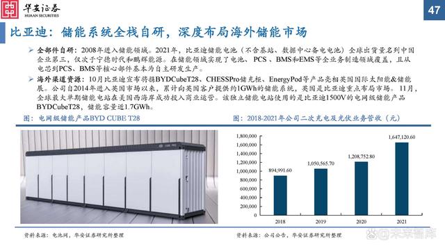 海外渠道資源:10月比亞迪宣布將攜BYDCubeT28、CHESSPro儲(chǔ)充柜、EnergyPod等產(chǎn)品亮相英國(guó)國(guó)際太陽能&儲(chǔ)能展。公司自2014年進(jìn)入英國(guó)市場(chǎng)以來,累計(jì)向英國(guó)客戶提供約1GWh的儲(chǔ)能系統(tǒng),英國(guó)是比亞迪重點(diǎn)布局市場(chǎng)。11月,全球最大單期儲(chǔ)能電站在美國(guó)西海岸成功投入商業(yè)運(yùn)營(yíng)。該獨(dú)立儲(chǔ)能電站使用的是比亞迪1500V的電網(wǎng)級(jí)儲(chǔ)能產(chǎn)品BYDCubeT28,儲(chǔ)能容量近1.7GWh。