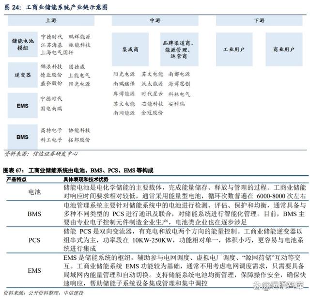 工商業(yè)儲(chǔ)能系統(tǒng)產(chǎn)業(yè)鏈完善,與大儲(chǔ)、戶儲(chǔ)同源。上游是各類設(shè)備,中游是系統(tǒng)集成商和開(kāi)發(fā)運(yùn)營(yíng)商,下游是工商業(yè)運(yùn)營(yíng)商。上游部件環(huán)節(jié)中,儲(chǔ)能電池模組由電芯經(jīng)過(guò)串并聯(lián)組成用以儲(chǔ)存電力;逆變器進(jìn)行交流電與直流電的轉(zhuǎn)換,根據(jù)功率指令對(duì)電池進(jìn)行充放電;BMS 是控制、管理電池各項(xiàng)功能并保護(hù)電池的核心部件,亦具備和 EMS、SCADA(能量管理系統(tǒng)及監(jiān)控系統(tǒng))通訊功能,目前也有部分電池廠家開(kāi)始自主設(shè)計(jì) BMS;EMS 控制逆變器并采集逆變器數(shù)據(jù)、控制電池模組并采集電芯數(shù)據(jù)、執(zhí)行邏輯(各種應(yīng)用)并與其他設(shè)備集成調(diào)度。中游集成商與品牌渠道商直接與下游工商業(yè)用戶對(duì)接,需要對(duì)BMS/EMS 系統(tǒng)及儲(chǔ)能應(yīng)用場(chǎng)景有著高理解,且 BMS/EMS 系統(tǒng)基本為自研,以完成對(duì)上游設(shè)備的高效整合。