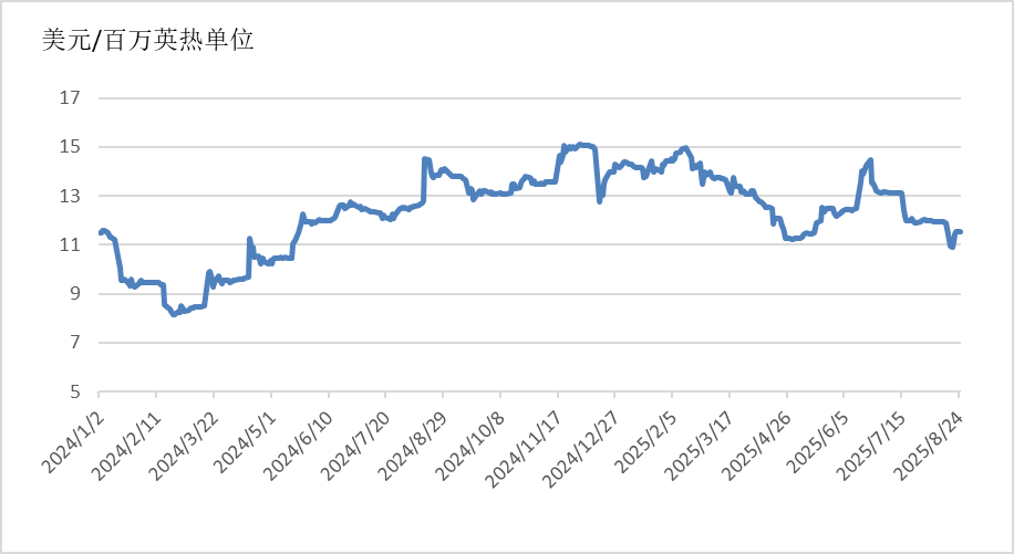 8月,美國天然氣價(jià)格震蕩下行。8月上旬,美國大部分地區(qū)氣溫下降,制冷需求減少,居民、商業(yè)用氣量減少5.2%,發(fā)電用氣量下降15.6%,為今年以來單周最大降幅。美國LNG出口終端穩(wěn)定高效運(yùn)行,全美液化天然氣加工量維持在160億立方英尺/日左右。供應(yīng)方面,7月以來,美國活躍天然氣鉆機(jī)數(shù)量增長至近兩年高位,推動(dòng)總產(chǎn)量提升至1065億立方英尺/日左右,較去年同期上漲2.79%。庫存方面,截至8月8日,周度庫存增加560億立方英尺,遠(yuǎn)超于市場普遍預(yù)期的530億立方英尺,與過去5年同期均值相比庫存上漲6.56%。高于歷史同期的產(chǎn)量和充足的庫存加劇看空壓力,美國天然氣價(jià)格承壓下行。8月4日,美國Henry Hub天然氣價(jià)格收于2.952美元/百萬英熱單位,時(shí)隔3個(gè)月再次下降至3美元/百萬英熱單位以下。8月中下旬,美國多州氣溫上升,推升制冷需求,帶動(dòng)天然氣總消費(fèi)量上漲。但受颶風(fēng)“艾琳”侵?jǐn)_影響,F(xiàn)reeport、Sabine Pass、Cameron LNG出口終端相繼進(jìn)入檢修,全美液化天然氣加工量降至每日155億立方英尺左右。供應(yīng)方面,隨著鉆機(jī)數(shù)量階段性地穩(wěn)定增加,全美天然氣產(chǎn)量增加至1070億立方英尺/日左右,持續(xù)刷新歷史高位。庫存方面,盡管庫存增量不及市場預(yù)期,但仍高于過去5年同期均值。在氣溫下降預(yù)期增強(qiáng)、颶風(fēng)或?qū)⒊掷m(xù)影響液化天然氣出口、全美天然氣產(chǎn)量持續(xù)刷新歷史高位、天然氣庫存充足、競爭性能源價(jià)格下跌等多重利空因素影響,8月22日,Henry Hub天然氣期貨價(jià)格收于2.692美元/百萬英熱單位,這是自2024年11月以來Henry Hub天然氣期貨價(jià)格首次下降至2.7美元/百萬英熱單位以下。