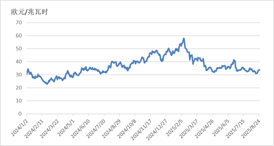 8月,歐洲天然氣價(jià)格先降后升。8月上中旬,西北歐多數(shù)地區(qū)氣溫較為穩(wěn)定,制冷需求窄幅波動(dòng),住宅和商業(yè)部門天然氣消費(fèi)量有所下跌。供應(yīng)方面,挪威管道氣進(jìn)口量持續(xù)強(qiáng)勁,液化天然氣進(jìn)口量也表現(xiàn)穩(wěn)定,高于近些年季節(jié)性平均水平,供給整體平穩(wěn)且儲(chǔ)氣庫注氣進(jìn)展順利。此外,市場對(duì)于美俄峰會(huì)進(jìn)展持樂觀預(yù)期,疊加原油、煤炭等能源價(jià)格呈下降趨勢,多空交織下,西北歐氣價(jià)震蕩下行。8月15日,TTF天然氣期貨價(jià)格收于31.031歐元/兆瓦時(shí),為2024年8月以來的最低水平。8月下旬,挪威新一輪管道氣大規(guī)模檢修期臨近,美國颶風(fēng)導(dǎo)致多處LNG出口設(shè)施檢修,歐洲LNG進(jìn)口量與北海管道氣供給均減少;同時(shí)歐洲地下儲(chǔ)氣庫注氣量周環(huán)比下降5.4%。此外,俄烏和談并無實(shí)質(zhì)性進(jìn)展削弱了市場對(duì)于俄氣回歸的預(yù)期,供給整體減少,疊加歐洲新能源發(fā)電量預(yù)期下調(diào),利好因素主導(dǎo)市場氛圍,TTF近月期貨價(jià)格快速反彈,升至33歐元/兆瓦時(shí)以上。